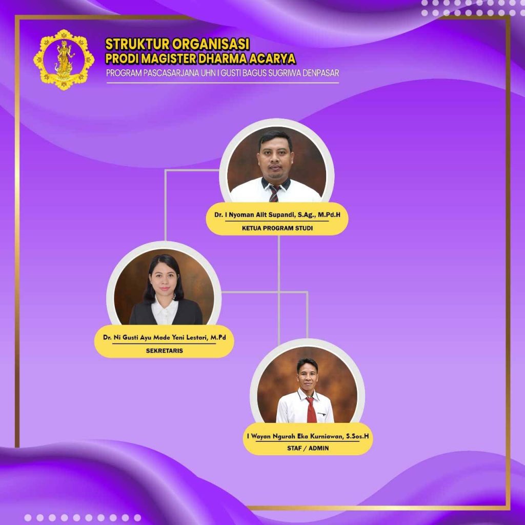 Struktur organisasi yang kami perkenalkan dalam panduan ini dirancang untuk mendukung visi dan misi Program Magister Dharma Acarya, yakni mengembangkan kajian ilmu keagamaan Hindu yang berlandaskan nilai-nilai luhur budaya Bali dan kearifan lokal. Dengan adanya struktur yang jelas dan terarah, kami yakin seluruh sivitas akademika dapat bekerja secara sinergis dalam mencapai tujuan bersama, yaitu mencetak lulusan yang berkualitas, berintegritas, dan siap berkontribusi bagi kemajuan agama, bangsa, dan negara.