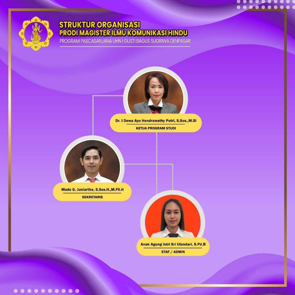 Dengan penuh rasa syukur dan bangga, kami mempersembahkan Struktur Oragnisasi ini yang berisi pengenalan struktur organisasi pada Program Magister Ilmu Komunikasi Hindu, Program Pascasarjana Universitas Hindu Negeri I Gusti Bagus Sugriwa Denpasar. Struktur Organiasi ini disusun untuk memberikan pemahaman yang mendalam tentang susunan, peran, dan tanggung jawab setiap elemen dalam struktur organisasi kami. Harapan kami, panduan ini dapat menjadi acuan bagi mahasiswa, dosen, dan seluruh staf dalam menjalankan peran masing-masing dengan lebih efektif dan efisien.